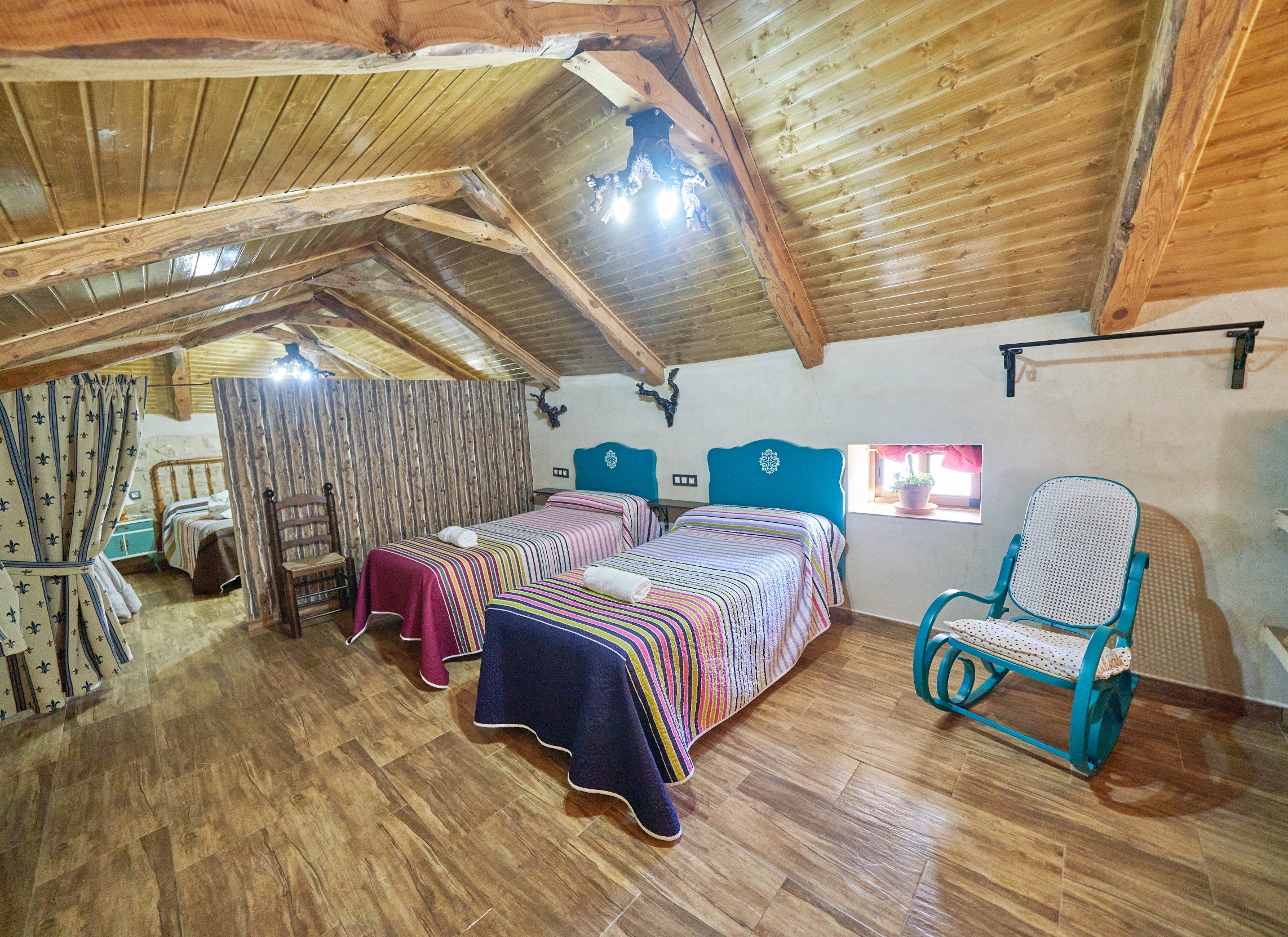 La segunda planta ofrece un espacio abuhardillado diáfano entre paredes de piedra originales. En esta zona abuhardillada, encontrarás cuatro camas individualesy una cama doble, conformando un espacio acogedor a la vez que íntimo. Este espacio cuenta con un baño adicional.